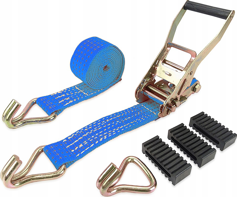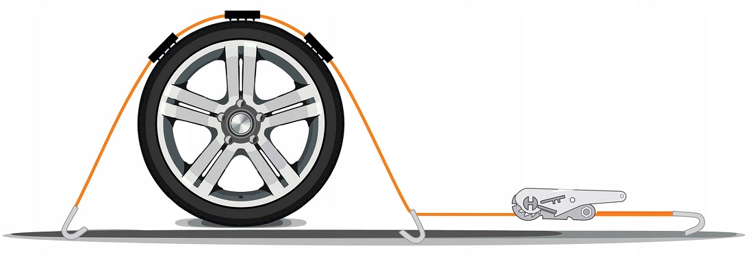 Spanngurt Autotransport mit TÜV Siegel, 3-Punkt mit Spannratsche & 3 Haken, zur Sicherung von PKWs mit Plastikkeilen für das Rad, 50mm x 3m bis zu 4t