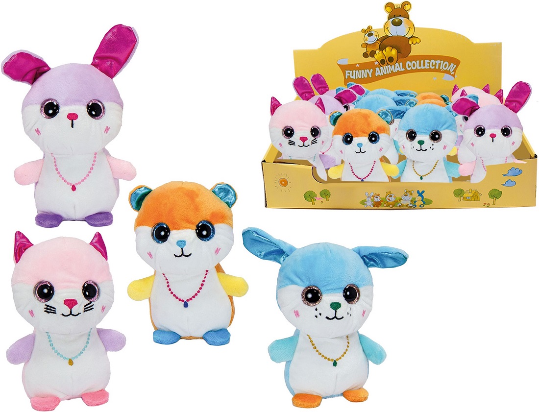 Plüsch Tiere stehend mit gestickter Kette & GlitzerAugen & Glitzer Applikationen an den Ohren 4/s ca. 15cm