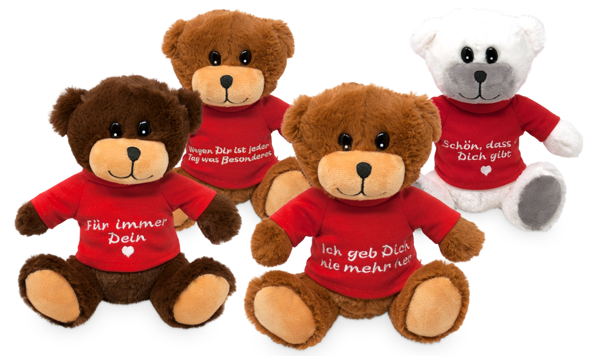 Plüsch Bär sitzdend, braun, dunkelbraun, grau 4/s rotes T-Shirt mit Sprüche ca.20cm