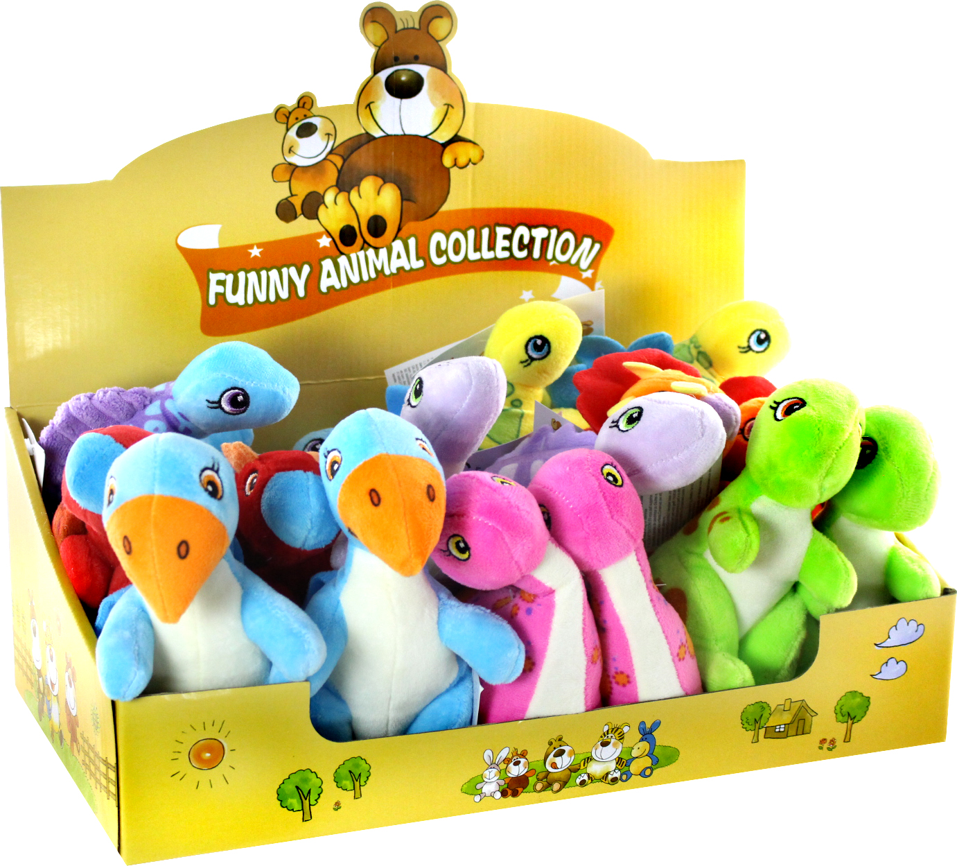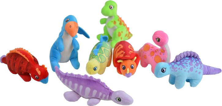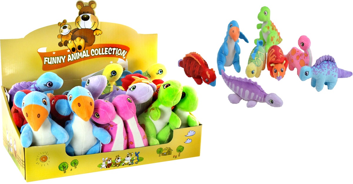 Plüsch Dinos stehend und sitzend in bunten Farben ca. 15-25cm 8/s in 16er T-Dsp.