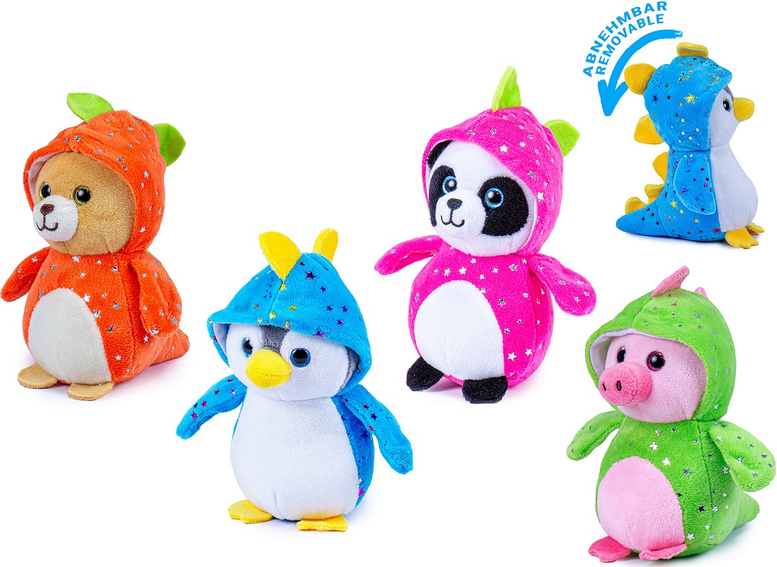 Plüsch Tiere stehend im Drachenkostüm mit GlitzerAugen & abnehmbarer Kaputze ca. 17cm 4/s (Bär, Pinguin, Panda, Schwein)