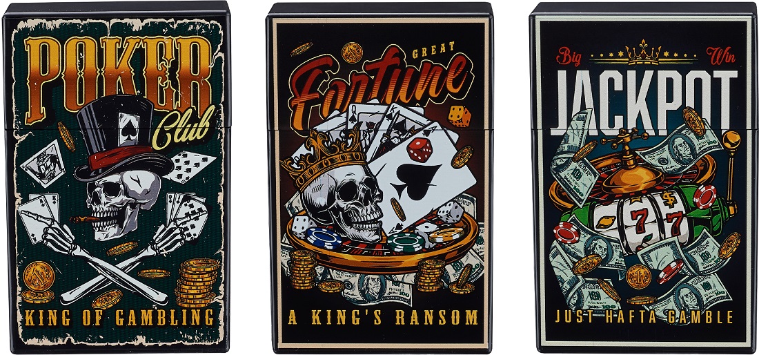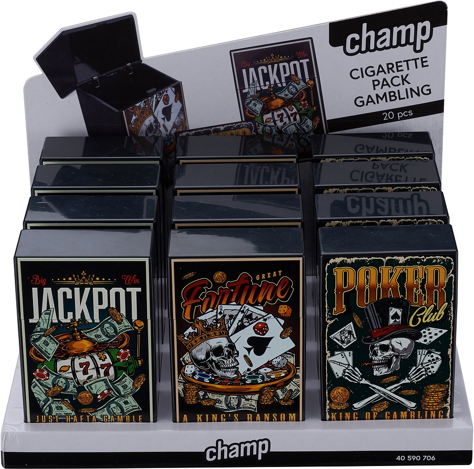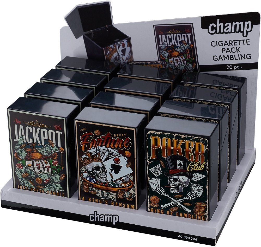 Zigaretten Box Dose GAMBLING für 20 Zigaretten Kunststoff 3/s in 12er T-Dsp.