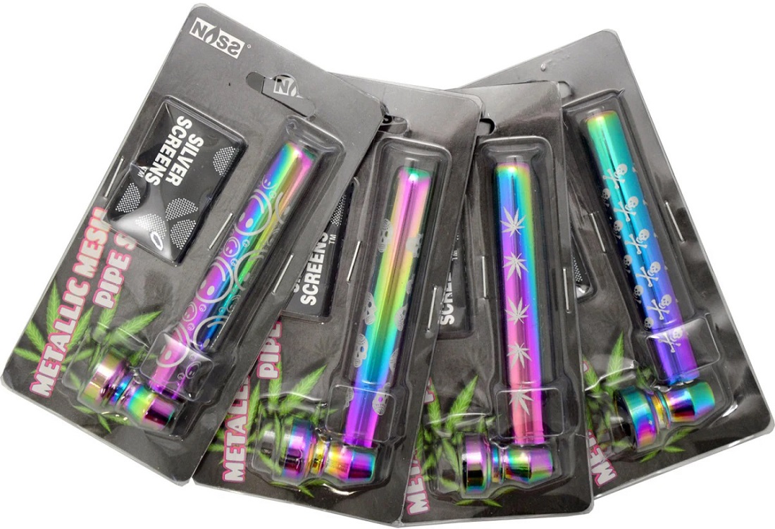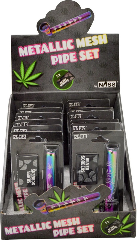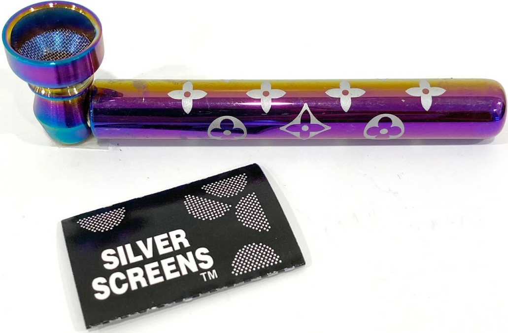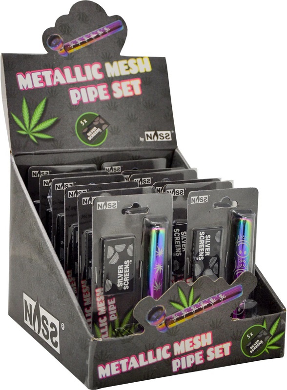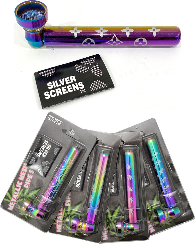 Tabak-Pfeife Metallic Mesh Pipe Icy Colors mit versch. Motiven & mit je 5 Ersatz-Sieben im 12er T-Dsp.