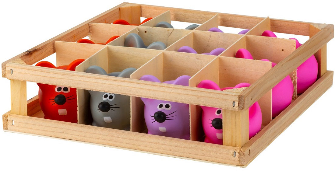 Bunte Deko-Mäuse ca. 5,5cm 4/s (Rot, Grau, Lila, Pink) in 12er Holzbox