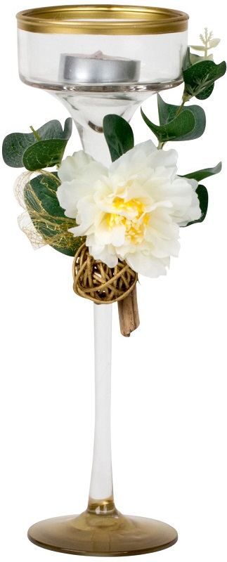 Deko Teelichthalter aus Glas mit weißer Blume & goldenen Applikationen ca. 25cm