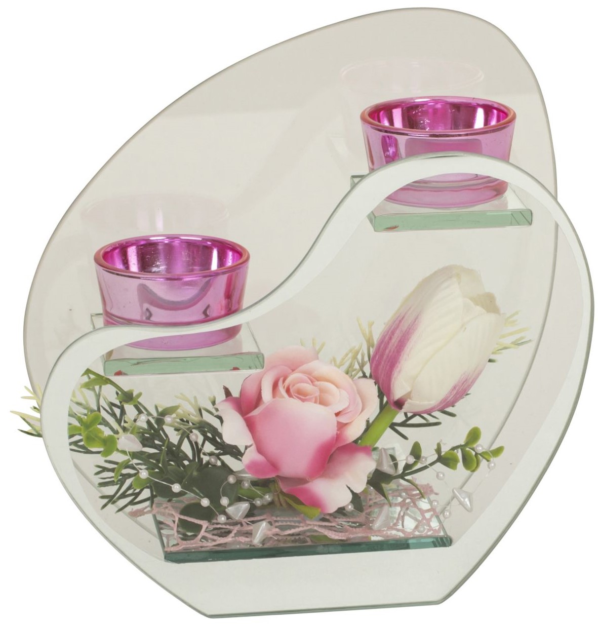 Glasdeko mit Blumen mit 2 Teelichthalter ca. h=19cm