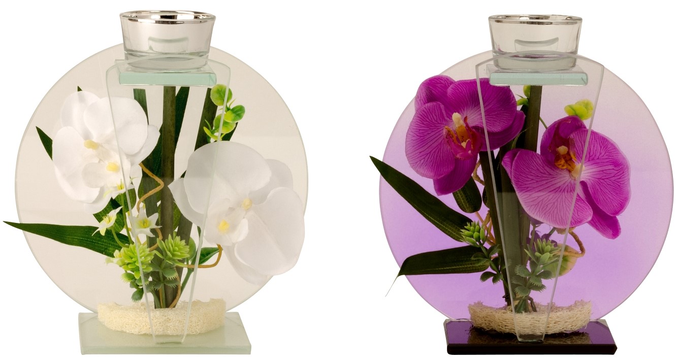 Glasdekoration mit Orchidee in lila&weiß 2/s ca. h=18cm b=15cm
