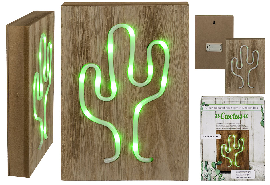 Grüne Neon-Leuchte in Holzbox, Kaktus,ca. 24 x 17 cm, für 2 Mignon Batterien (AAA) in Geschenkbox