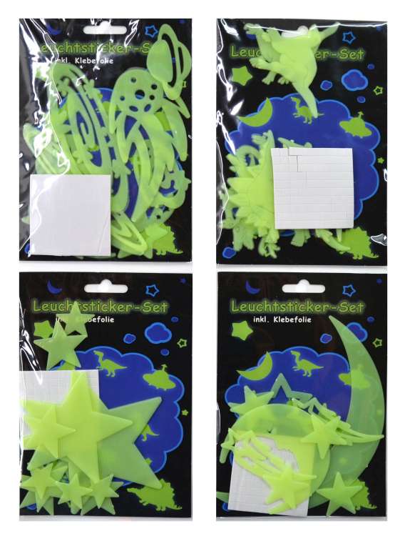 Leuchtsticker Set "Glow in the Dark" 4-Design einzelpackung inkls. Klebefolie im 36er Dsp.