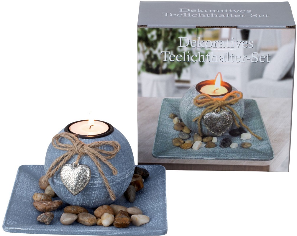 Teelichthalter rund mit Herzdeko & Deko-Steinen ca. 8 x 16 x 16cm