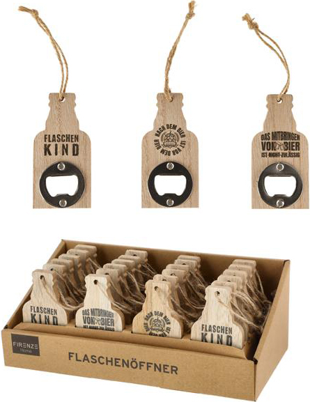 Flaschenöffner mit lustigen Sprüchen zum Hängen ca. 10cm 3/s aus MDF/Metall in 24er T-Dsp. ("Flaschen Kind", "Nach dem Bier ist vor dem Bier", "Das mitbringen von Bier (…)")