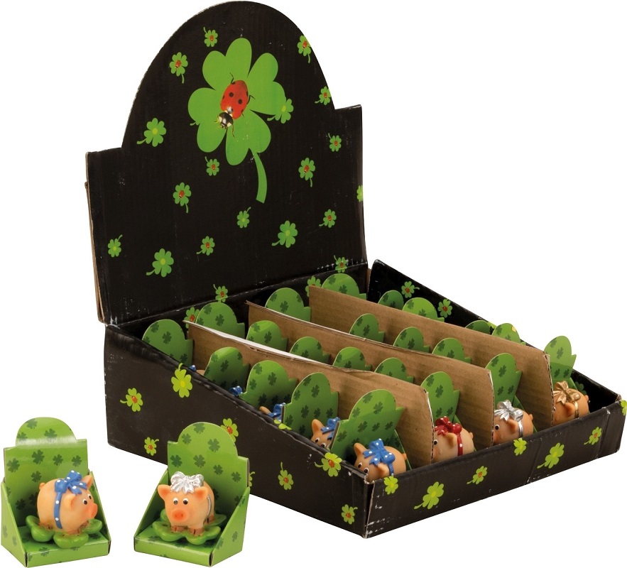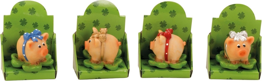 Glücksschweinchen auf Kleeblatt mit Schleife ca. 3,2 x 3,5cm 4/s im 24er T-Dsp.