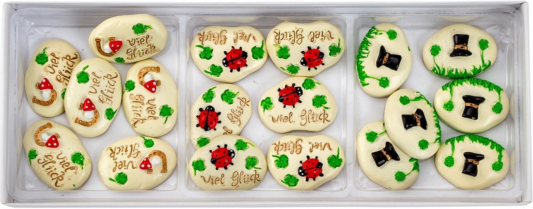 Glückssteine mit Glücksmotiven "Viel Glück" ca. 3 x 2cm 3/s in 18er PVC-Box (Huf