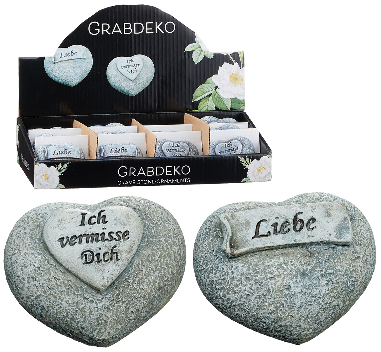 Grabdeko Herz mit Spruch, Polyresin 50g, 2/s, ca.6cm 12er T-Dsp.