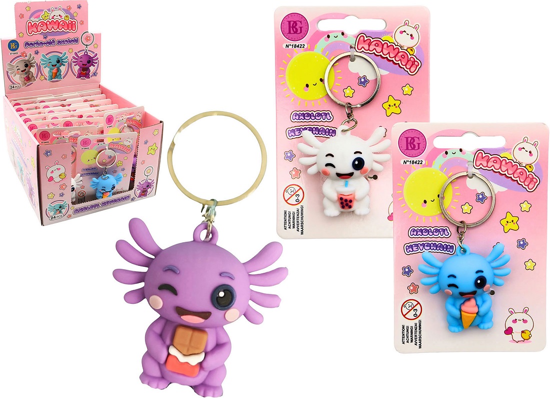 3D Axolotl Schlüsselanhänger mit Snack in der Hand ca. 4cm 3/s auf Blisterkarte im 24er T-Dsp. (Lila, Weiß, Blau)