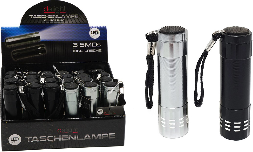 Taschenlampe Aluminium mit 3 SMD´s ca. 9cm mit Lasche benötigt 3xAAA (nicht inkl.) 2/s im 24er T-Dsp. (Silber, Schwarz)