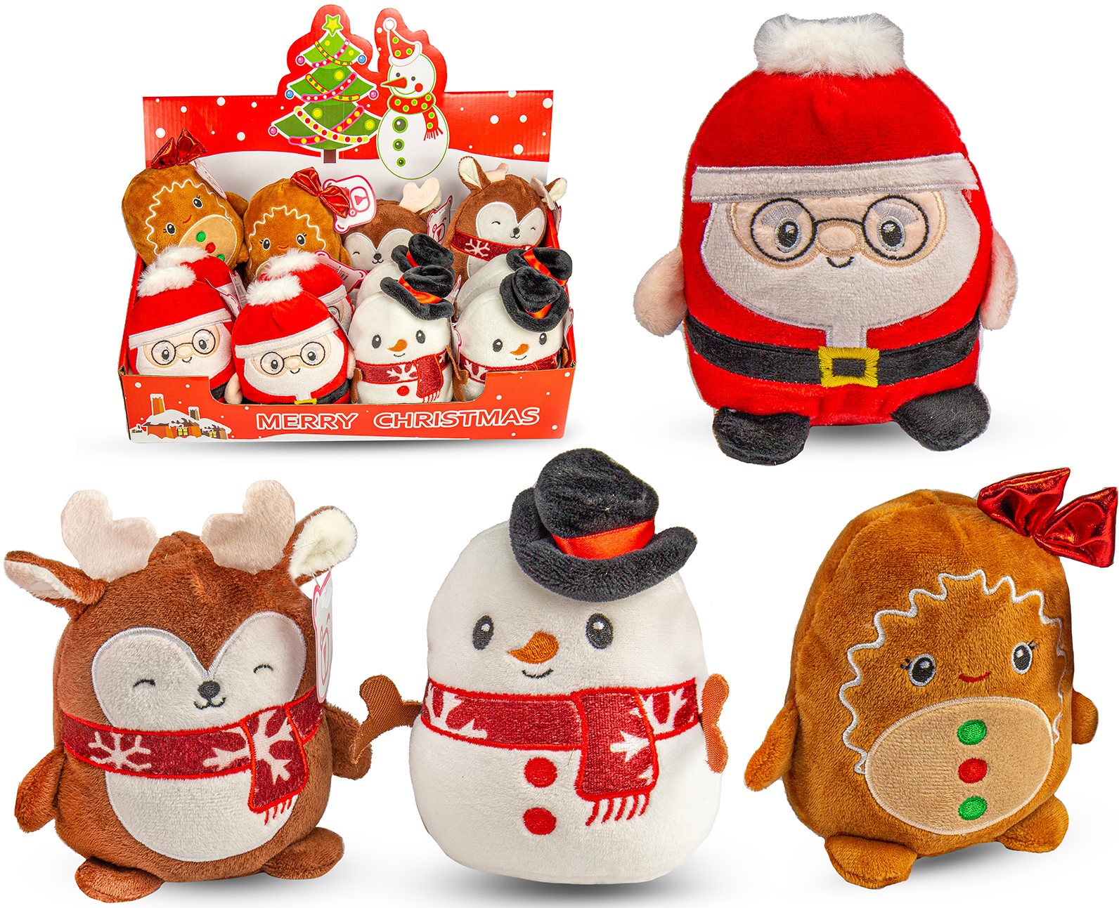 Plüsch Weihnachts Sortiment ca. 12cm 4/s in 12er T-Dsp. (Weihnachtsmann, Rentier, Schneemann, Lebkuchen)
