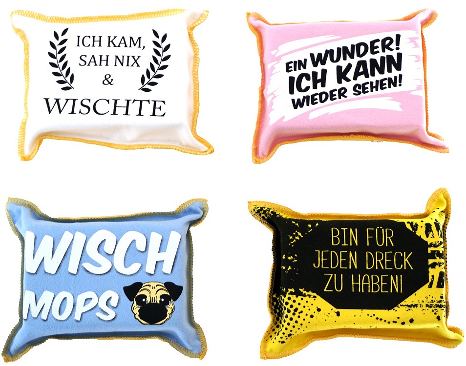 Autoschwamm mit Spruch 4/s scheibenklar, 13 x 10 x 5cm, einzeln verpackt (Ich kam, Sah Nix&Wischte, Ein Wunder Ich kann wieder Sehen, Wisch Mops, Bin für jeden Dreck zu haben)