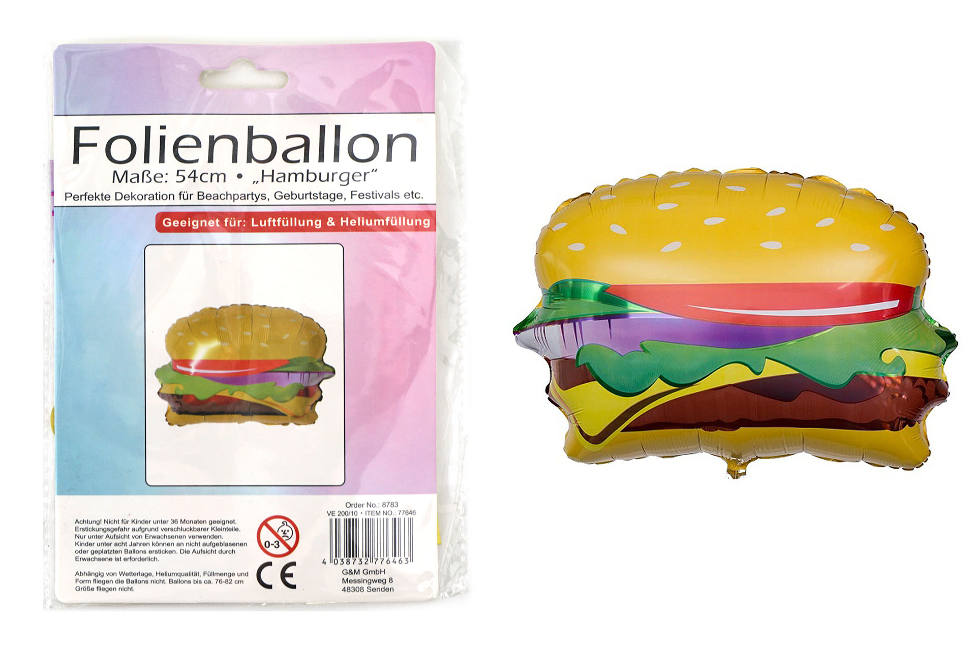 Folienballon "Hamburger" ca. 54cm befüllbar mit Helium/Luft in Polybag mit Einle
