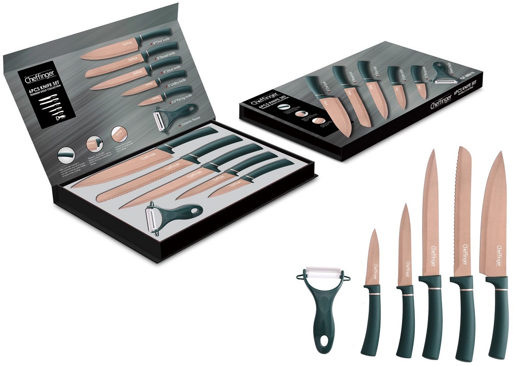 Messerset grün/gold Cheffinger 6 tlg. in Magnetic Box mit Kochmesser, Brotmesser, Universalmesser, Schälmesser und Keramik Schäler