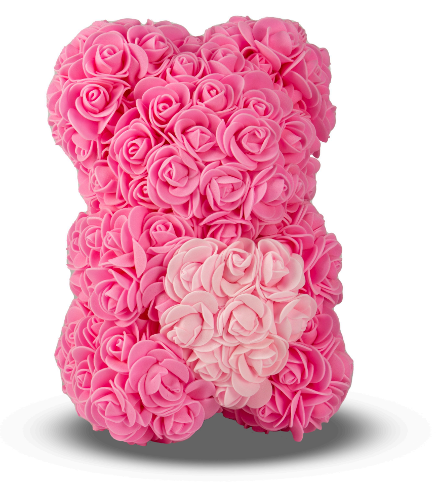 Rosen Teddy/Bär PINK mit HERZ Rosa inkl.PVC BOX&Schleife für SELBERAUFBAU! ca.25 cm aus PE Blumen&Schaum stoff.