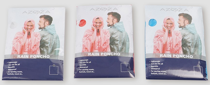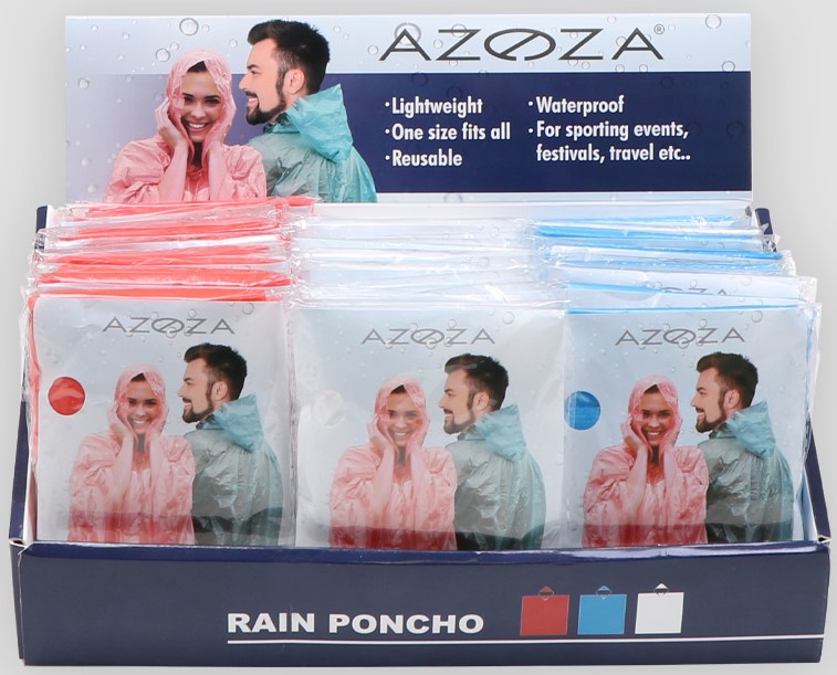 Regenponcho Azoza Universal-Größe, wiederverwendbar 3/s (Weiß, Rot, Blau) in 60er T-Dsp.