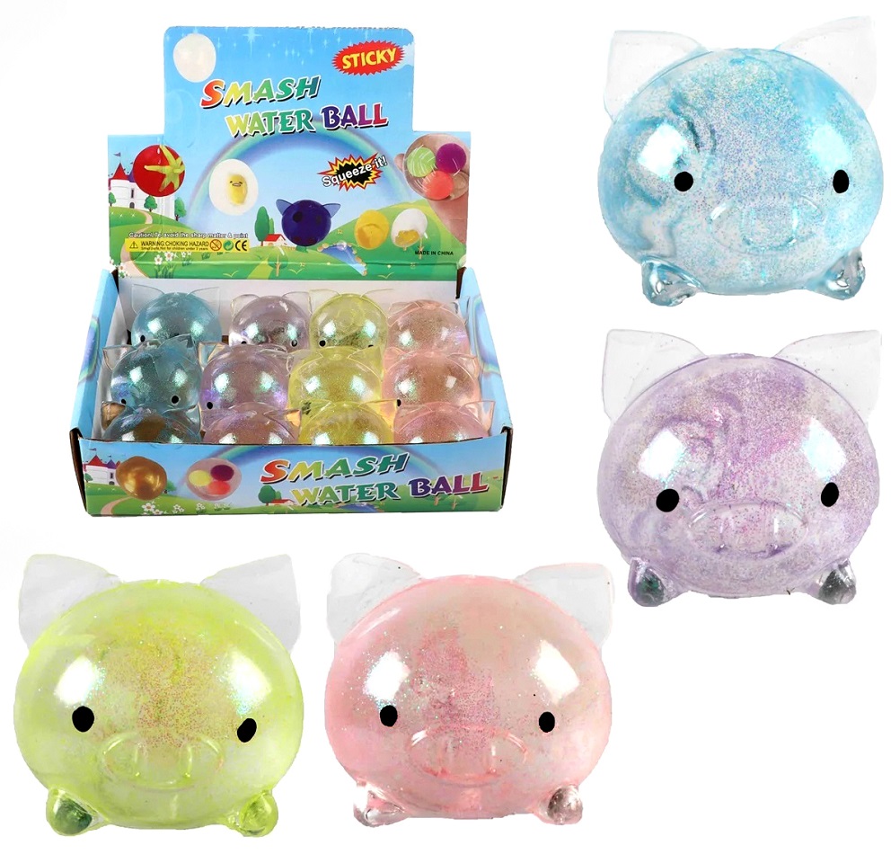Anti Stress Squeeze Ball süße Glitzer Schweinchen zum Quetschen 4/s (Blau, Lila, Pink, Grün) in 12er T-Dsp.