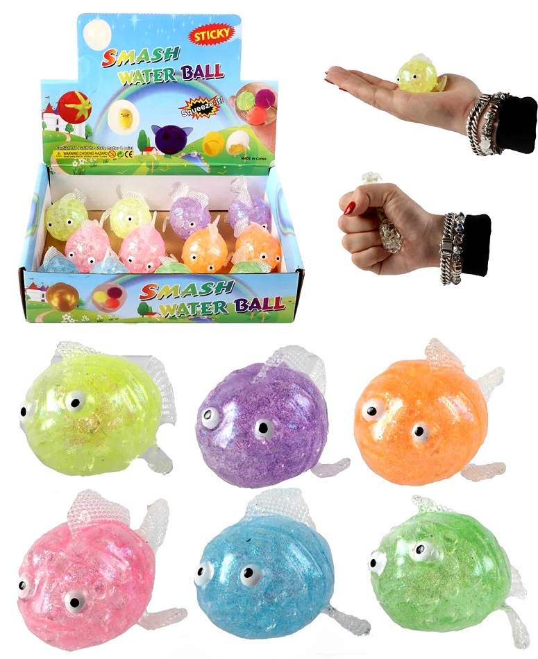 Anti Stress Squeeze Ball süßer Glitzer Goldfisch zum Quteschen 6/s (Gelb, Lila, Orange, Pink, Blau, Grün) in 12er T-Dsp.