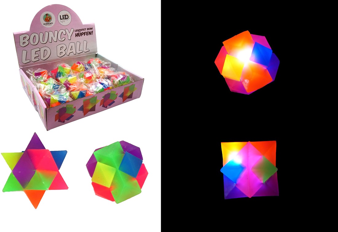Bouncy LED Ball Flummiball in versch. Formen, leuchtet beim Hüpfen 2/s in 12er T-Dsp.