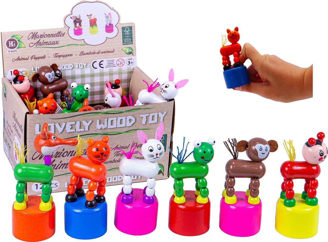 Holzfigur Tiere / Drücktiere tanzend 6/s (Fuchs, Hund, Katze, Frosch, Affe, Marienkäfer) ca. 10cm im 12er T-Dsp.