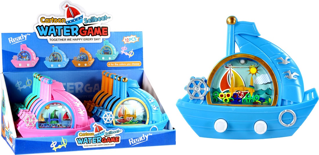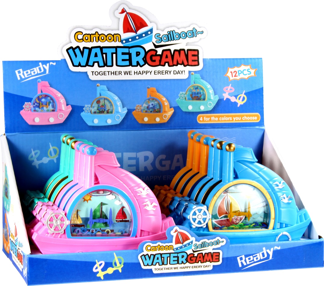 Watergame Cartoon Sailboat Geschicklichkeits-/Wasserspiel 4/s (Pink, Grün, Blau, Orange) in 12er T-Dsp.