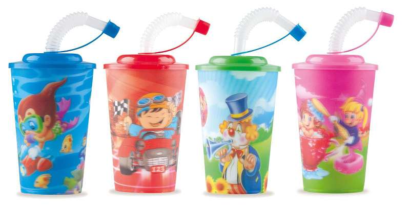 Trinkbecher 3D Motiven mit Trinkhalm 350ml 4-fach sort.