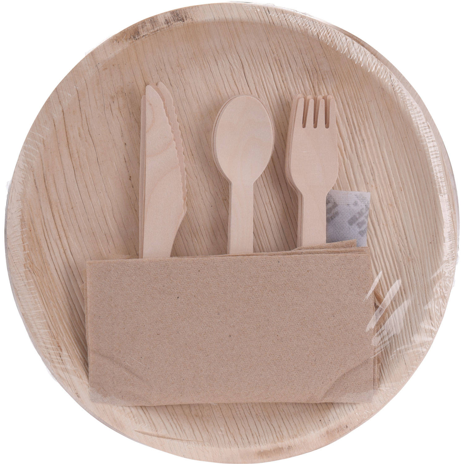 BBQ Teller-Set Natur Palmblätter+Papier mit Besteck 30tlg. Je 6x Teller d=25,5cm, Gabel, Löffel, Messer, Servietten wiederverwendbar
