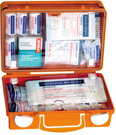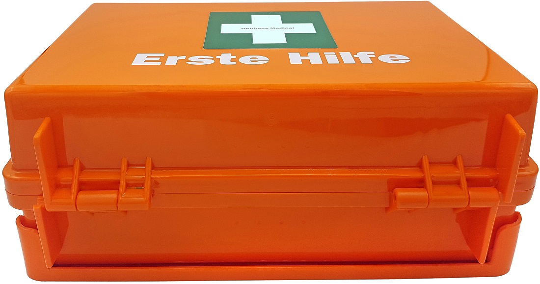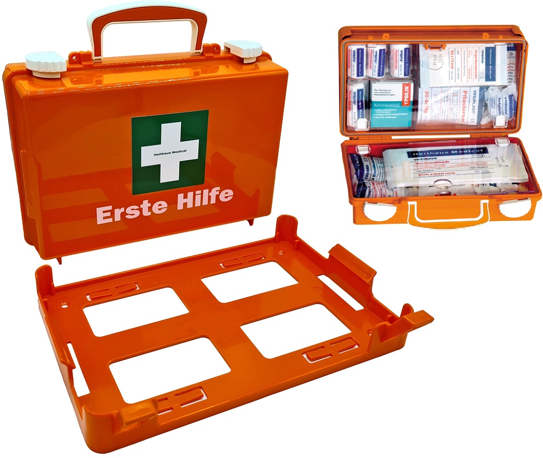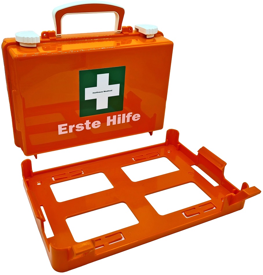 Erste-Hilfe-Koffer QUICK Orange 26x17x11cm Inhalt nach DIN 13157 inkl. Wandhalterung mit 90°-Stop Arretierung