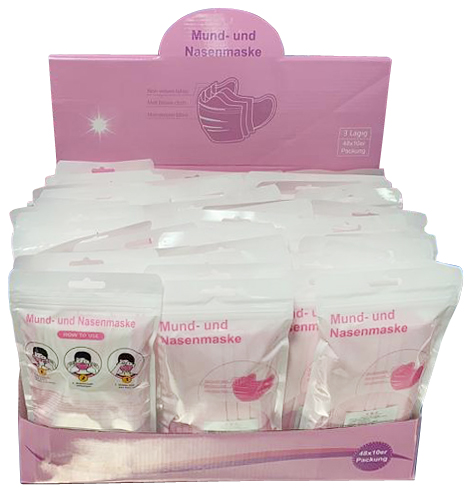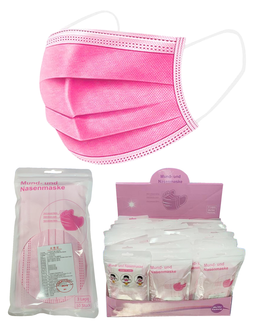 Mund Nasen Maske 3-lagig PINK mit Nasenbügel, Ohrschlaufen Einheitsgröße 10 Stück im Set(10er beutel) im 48x10er T-Dsp.