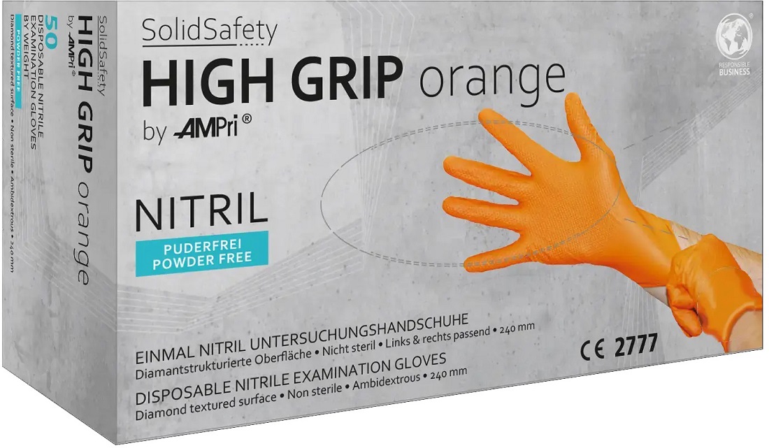 SolidSafety High Grip Nitril-Chemikalienschutzhandschuh Gr.M (Orange) puderfei 50er Box (ISO 374-1/Typ B; EN 374-5:2016; EN 420:2010; EN 455; EN 455-1)