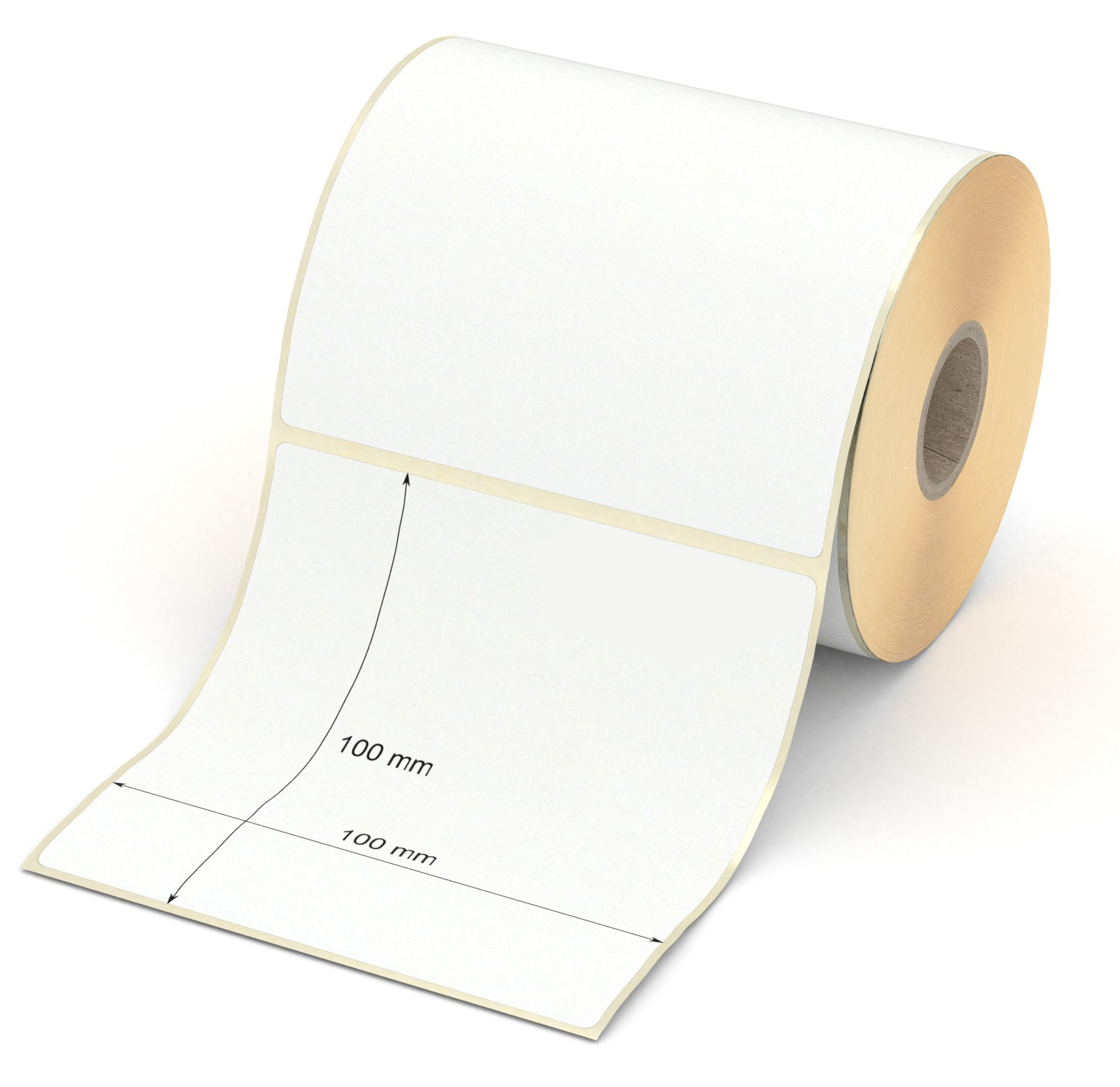 Thermodirekt-Versandetiketten für Desktopdrucker, Thermo-Eco Papier, unbeschichtet, weiß, matt, B:100 mm, H: 100mm, Trägerperforation, 1-bahnig 110 mm Rollenbreite, außen gewickelt, Rollenker 1 Zoll (25,4 mm) 500 Etiketten auf 1 Rolle(n)(1000 Etiketten auf 2 Rolle(n))