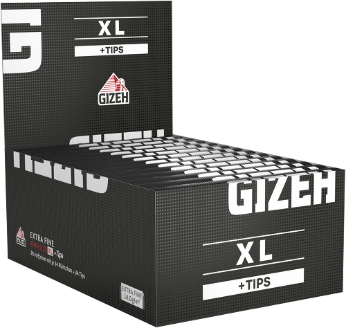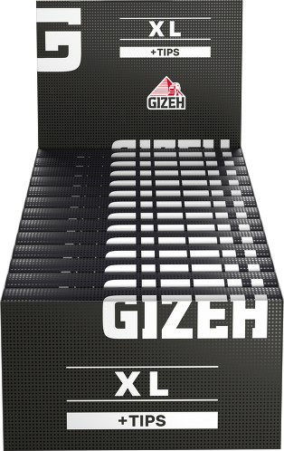 GIZEH BLACK® KING SIZE XL +TIPS 26 Heftchen á 34 Blättchen & 34 Tips, 9mm breiter, extrafeines Slow Burning Paper - geht aus wenn du nicht dran ziehst, natürliche Gummierung aus Gummiarabikum, im 26er T-Dsp.