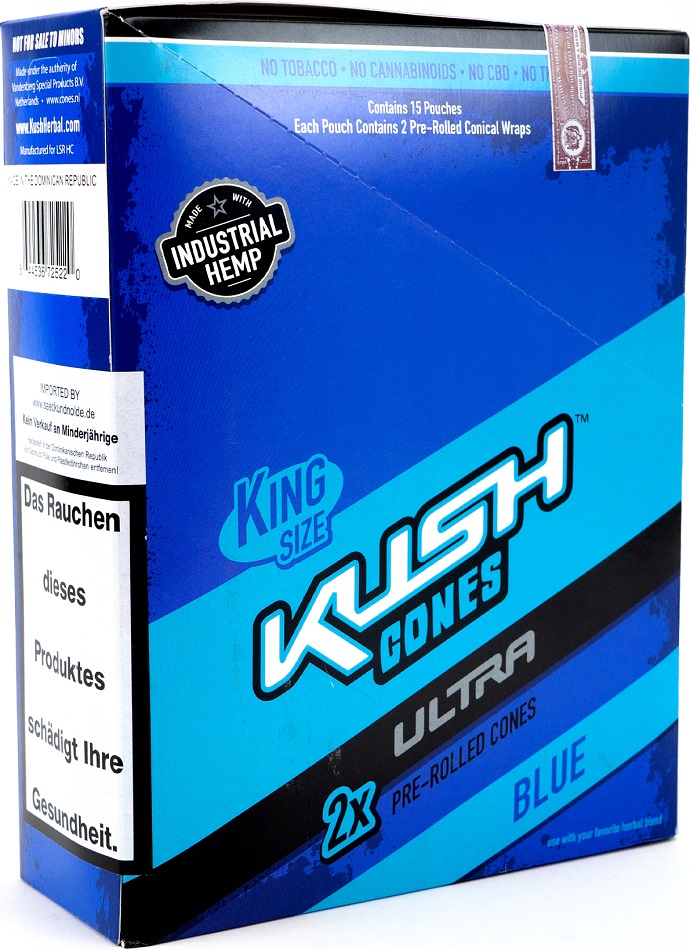 Cones Kush Ultra Herbal BLUE (Berries) Preroled Hanf Cones vorgedrehte Joint-Hüllen 2er Pack (15x 2 Cones) ca. 105mm mit Filter im 15er T-Dsp.