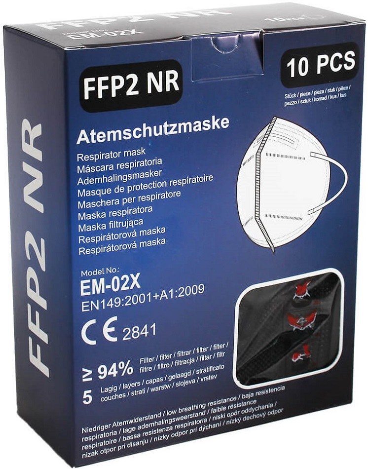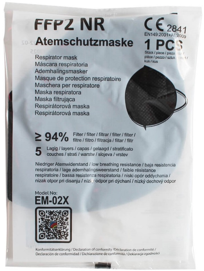 Mund-Nasen Maske FFP2 SCHWARZ 5-lagig EM-02X mit Ohrschlaufen Justierbarer Nasenbügel CE EN 149:2001+A1:2009 in 10er Verpackung