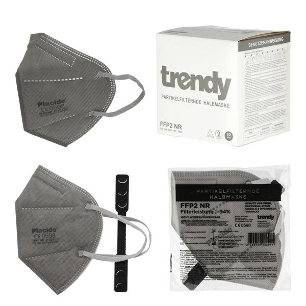 Partikelfilternde Halbmaske GRAU FFP2 NR 94% Placide trendy mit Ohrschlaufen Justierbarer Nasenbügel&Maskenhalter CE0598 - EN149-2001+A1-2009 Einzelpackung