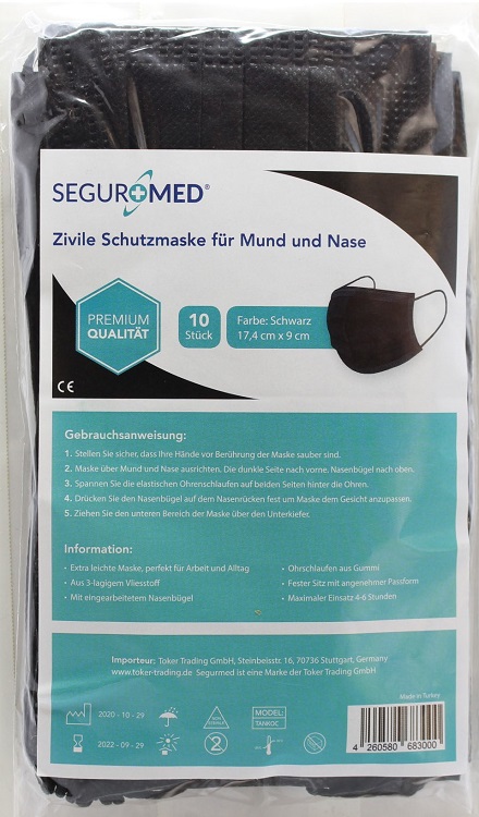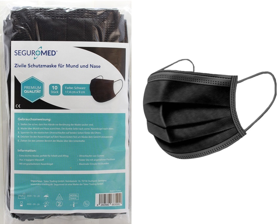 SEGURMED Mund Nasen Maske 3-lagig SCHWARZ mit Nasenbügel&Ohrschlaufen Einheitsgröße 10 Stück im Set(10er beutel)(preis pro stück)