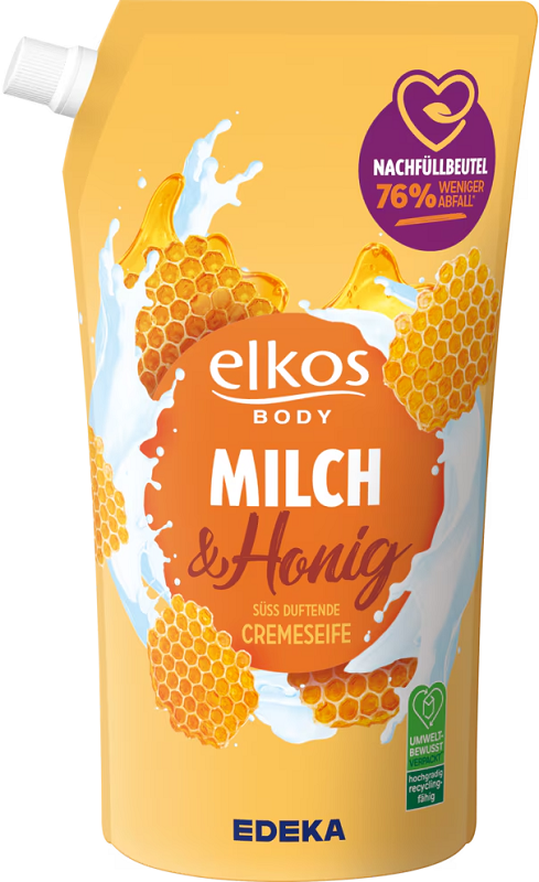 Elkos Flüssigseife MILCH / HONIG im 1000ml Nachfüllbeutel, süß duftend mit Milchproteinen und Honig, 76% weniger Abfall