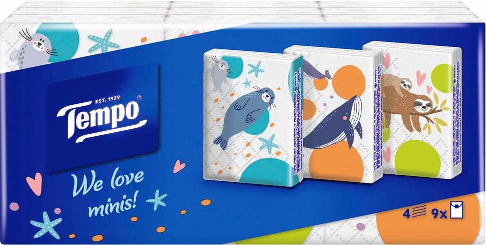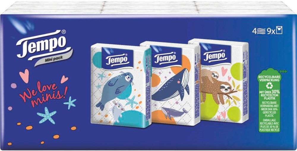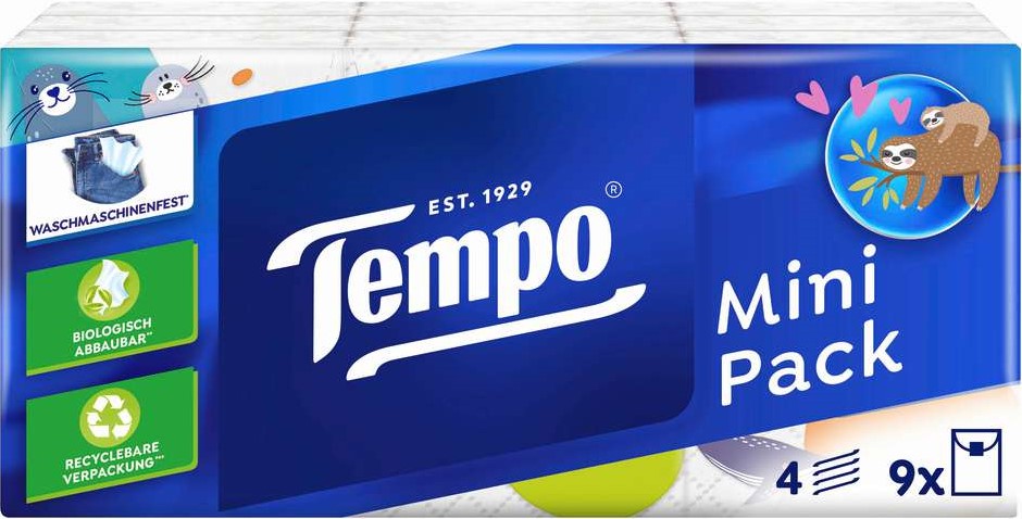 Tempo Taschentücher Mini Pack 9x 5 Tücher-Packs 4-lagig, Waschmaschinenfest, biologisch abbaubar, Recylebare Verpackung
