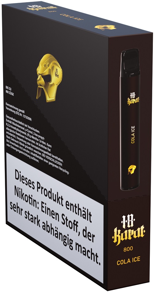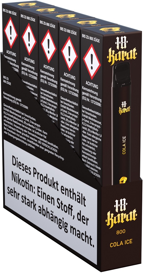 18 Karat E-Shisha COLA ICE - Nikotin 2ml Liquid Nic-Salt 16mg/ml ca. 800 Züge 400mAh Einweg-Pos System TPD konform 5er T-Dsp.(mit Steuerbanderole)