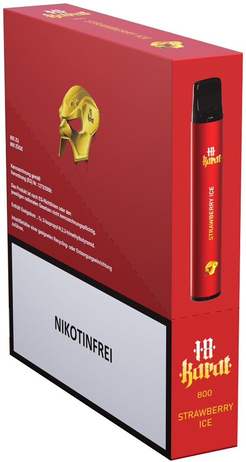 18 Karat E-Shisha STRAWBERRY ICE - NO Nikotin 0mg ca. 800 Züge 400mAh Einweg-Pos System TPD konform 5er T-Dsp.(mit Steuerbanderole)