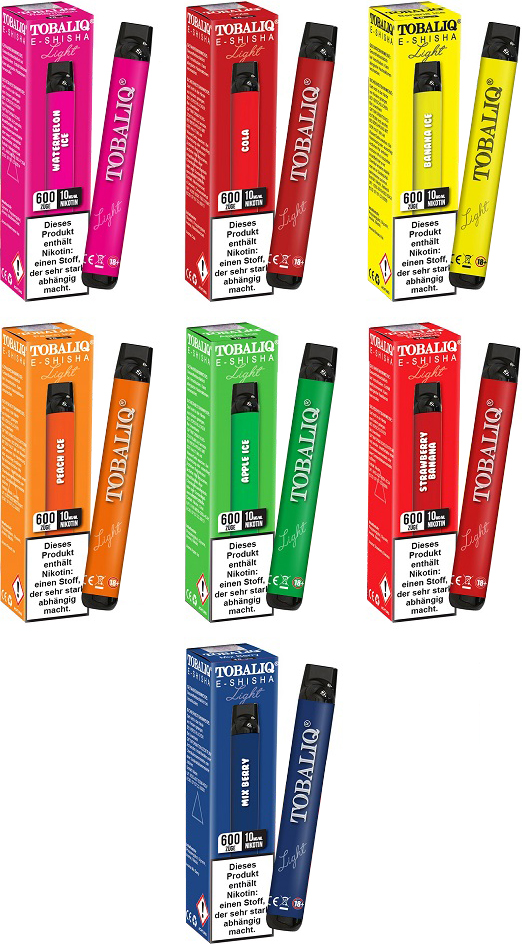 TobaliQ E-Shisha TQ-Smile Light E-Shisha MIX 144tlg. ca. 600 Züge - Nikotin 2ml Liquid Nikotin 10mg/ml 550mAh Einweg-Pos System TPD konform (30x Watermelon Ice, 50x Cola, 44x Banana Ice, 6x Peach Ice, 11x Apple Ice, 1x Strawberry Banana, 25x Mix Berries)(mit Steuerbanderole)