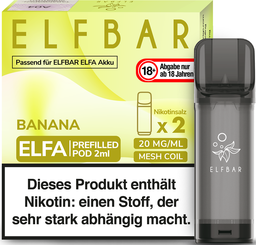 Elfbar ELFA CP Prefilled Pod BANANA ca. 600 Züge - Nikotin 2ml Liquid Nikotin 20mg/ml Prefilled-Pod System TPD konform 2er Pack in 10er T-Dsp.(kompatibel mit allen ELFA Basisgeräten)(mit Steuerbanderole)