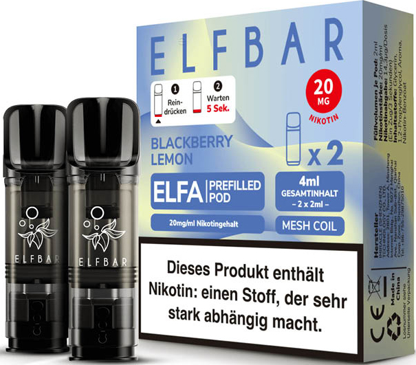 Elfbar ELFA CP Prefilled Pod BLACKBERRY LEMON ca. 600 Züge - Nikotin 2ml Liquid Nikotin 20mg/ml Prefilled-Pod System TPD konform 2er Pack in 10er T-Dsp.(kompatibel mit allen ELFA Basisgeräten)(mit Steuerbanderole)