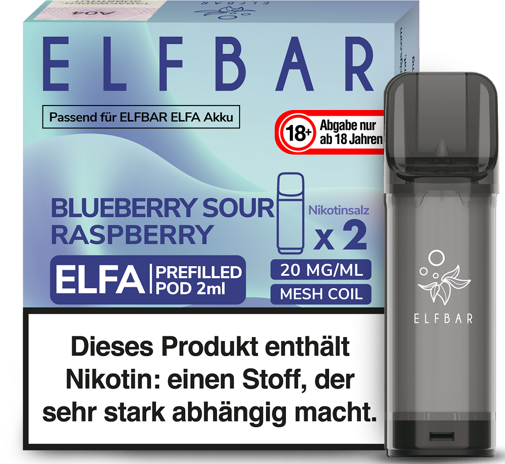 Elfbar ELFA CP Prefilled Pod BLUEBERRY SOUR RASPBERRY ca. 600 Züge - Nikotin 2ml Liquid Nikotin 20mg/ml Prefilled-Pod System TPD konform 2er Pack in 10er T-Dsp.(kompatibel mit allen ELFA Basisgeräten)(mit Steuerbanderole)